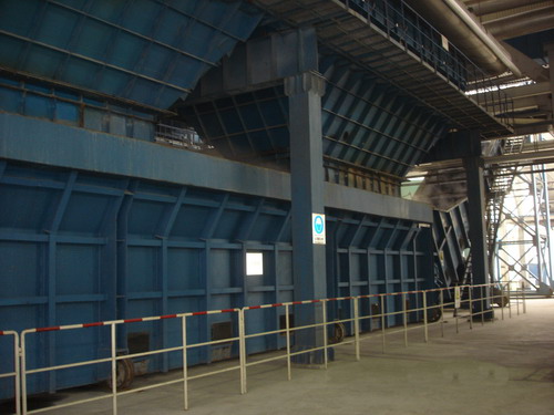 渣井布置在鍋爐下連箱下方,其主要功能是事故性儲渣和吸收鍋爐水冷壁的膨脹量。通常情況下,渣井具有不小于機(jī)組在MCR工況下4小時排渣的貯存容積,渣井支承方式通常采用獨(dú)立支撐式,當(dāng)采用獨(dú)立支撐式時,應(yīng)為下部撈渣機(jī)能橫向拉出檢修留有足夠的位置;渣井水封槽能有效地吸收鍋爐水冷壁垂直和水平方向的膨脹量,且水封槽中設(shè)有沖洗排污措施。當(dāng)采用懸吊式安裝時,不設(shè)水封槽,但鍋爐的膨脹量由下部設(shè)備吸收。
